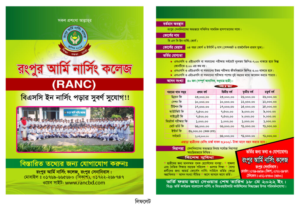 Rangpur Army Nursing College Admission 2021-2022 Leaflet